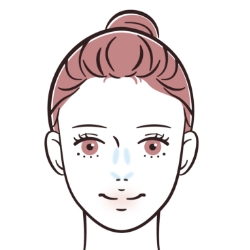 右上と左下のカラーで好きな色を作り、鼻筋の両サイドと鼻の下にV字をイメージして入れる。(鼻筋に入れるとき、目の横には入れないのがポイント)